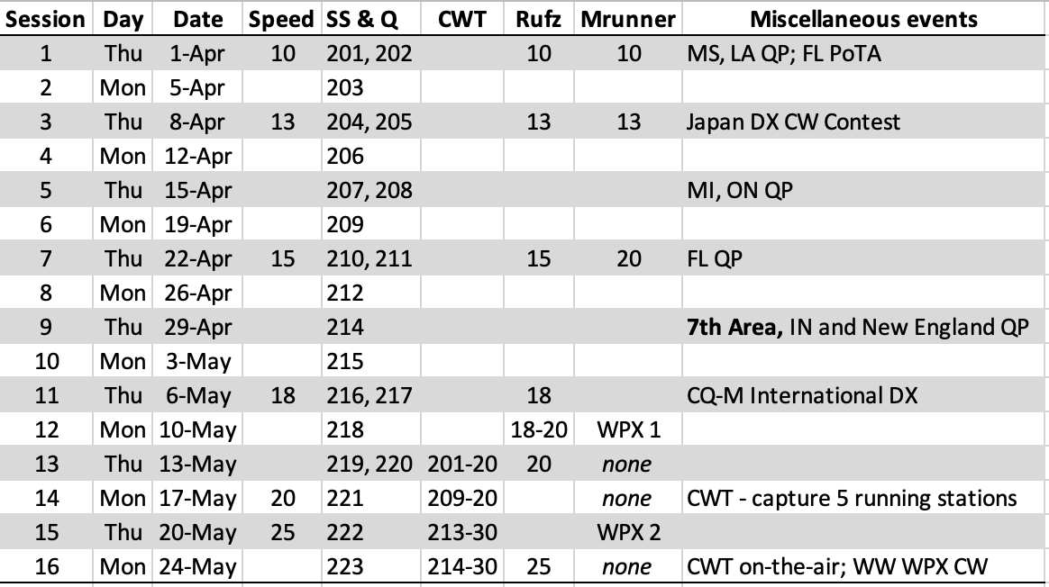 For the last two sessions, take some opportunity to get on the air with each other or visit sked.groups.io to see if anyone’s on. (SST runs Sunday and Friday now.) I don’t see any interesting and straightforward CW contests for the next two weeks. Other options include SOTAactivations or the ARRL Inter DX contest (exchange you send is simply RST and state). In a pinch, you can use Zoom.