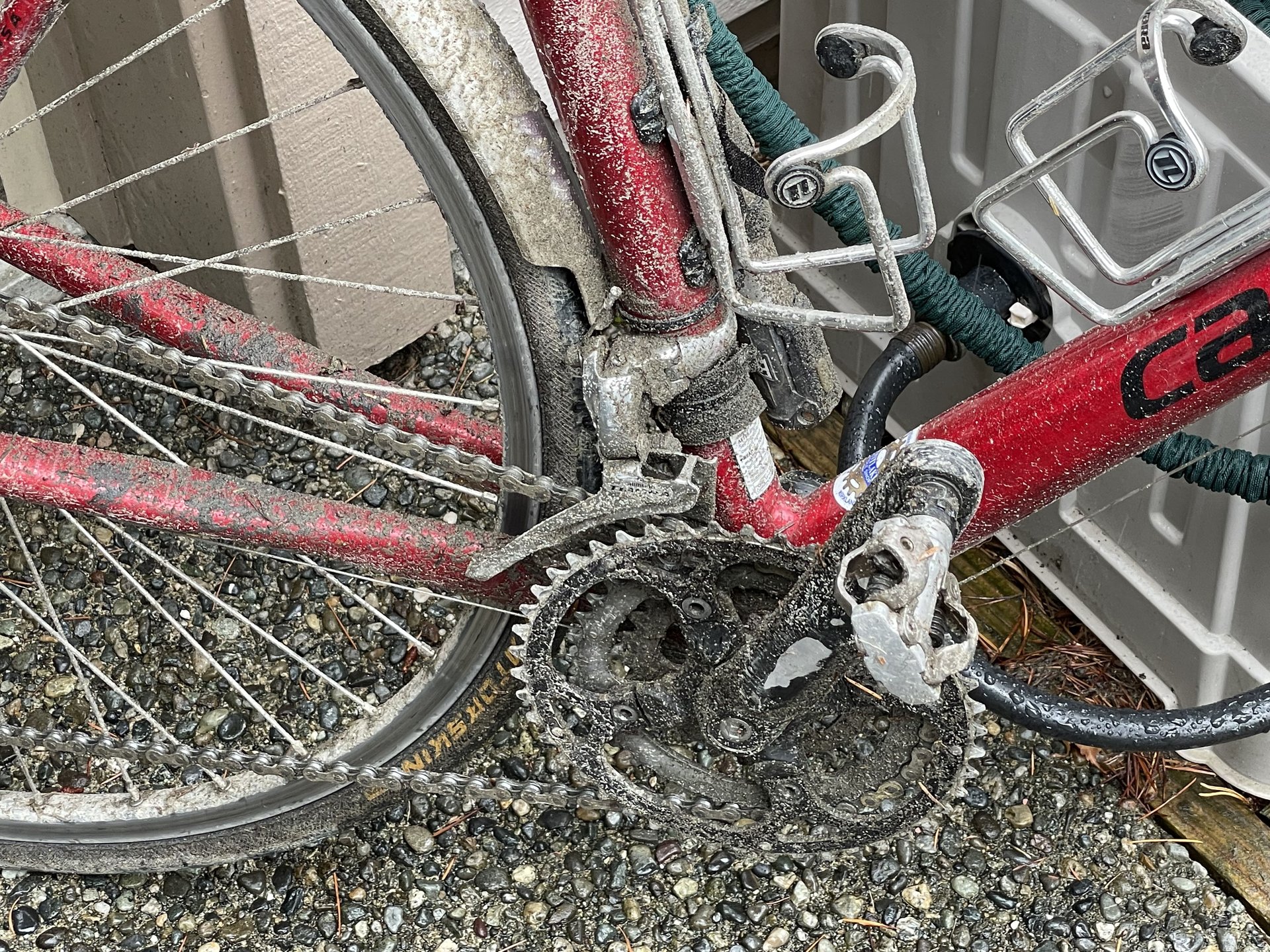 Once home, I gawk at how utterly dirty the drivetrain got, even with fenders.