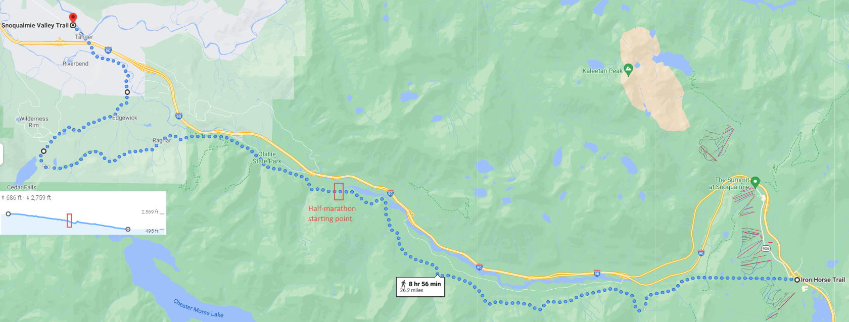 These marathons use the Palouse to Cascades State Park (aka “John Wayne” aka “Iron Horse” Trail) from Hyak to Rattlesnake Lake, joining the Snoqualmie Valley Trail to North Bend. The gentle, downhill route has some great scenery and can potentially lead to a qualifying time for the Boston Marathon.