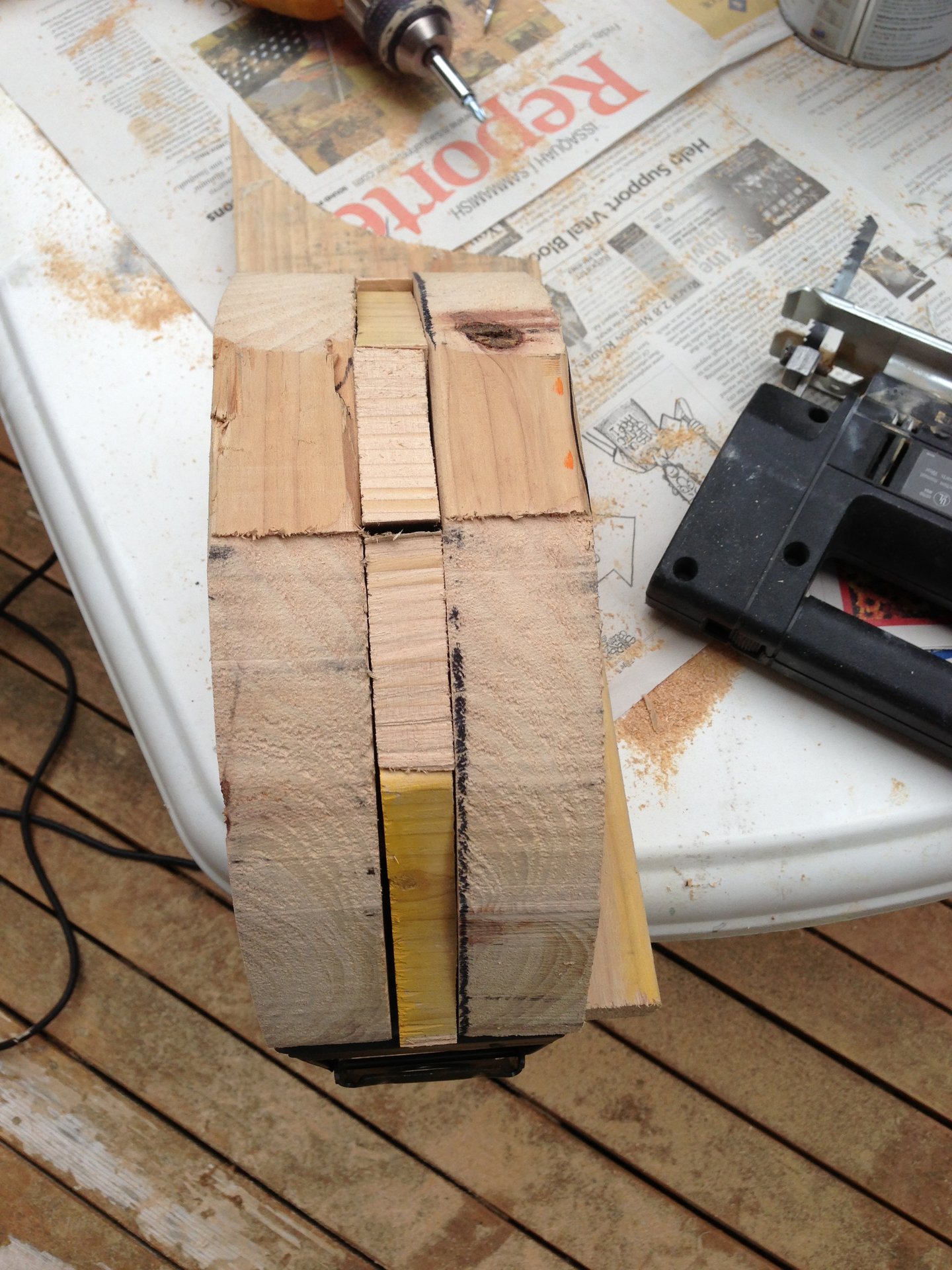 Not having done this before, I thought it would make sense to frame the tombstone “top” out of wood cut into roughly semicircles. I Filled in the gap with some random wood bits, then screwed it laterally, then through the steel moderate-sized ammo box lid.