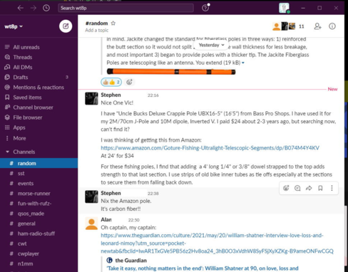 - We added channels for the tools (N1MM, CWPlayer and Morse Runner) once there were enough discussions to merit another. At one point, I also posted links to YouTube tutorials I made on using N1MM for CWT and using Morse Runner and slack was smart enough to embed them.