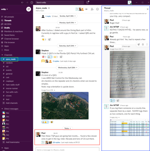 #qsos_made – a place to discuss QSOs, specifically actively seeking one or “brag” that they made one and offer encouragement to others doing the same. There are abundant emoji options that add some levity. Topics are naturally threaded. For example, during 7QP (7th area QSO party), there was a lot of activity as half of the students are in that area. A subset of the thread (red box) appears on the right navigation (blue box).