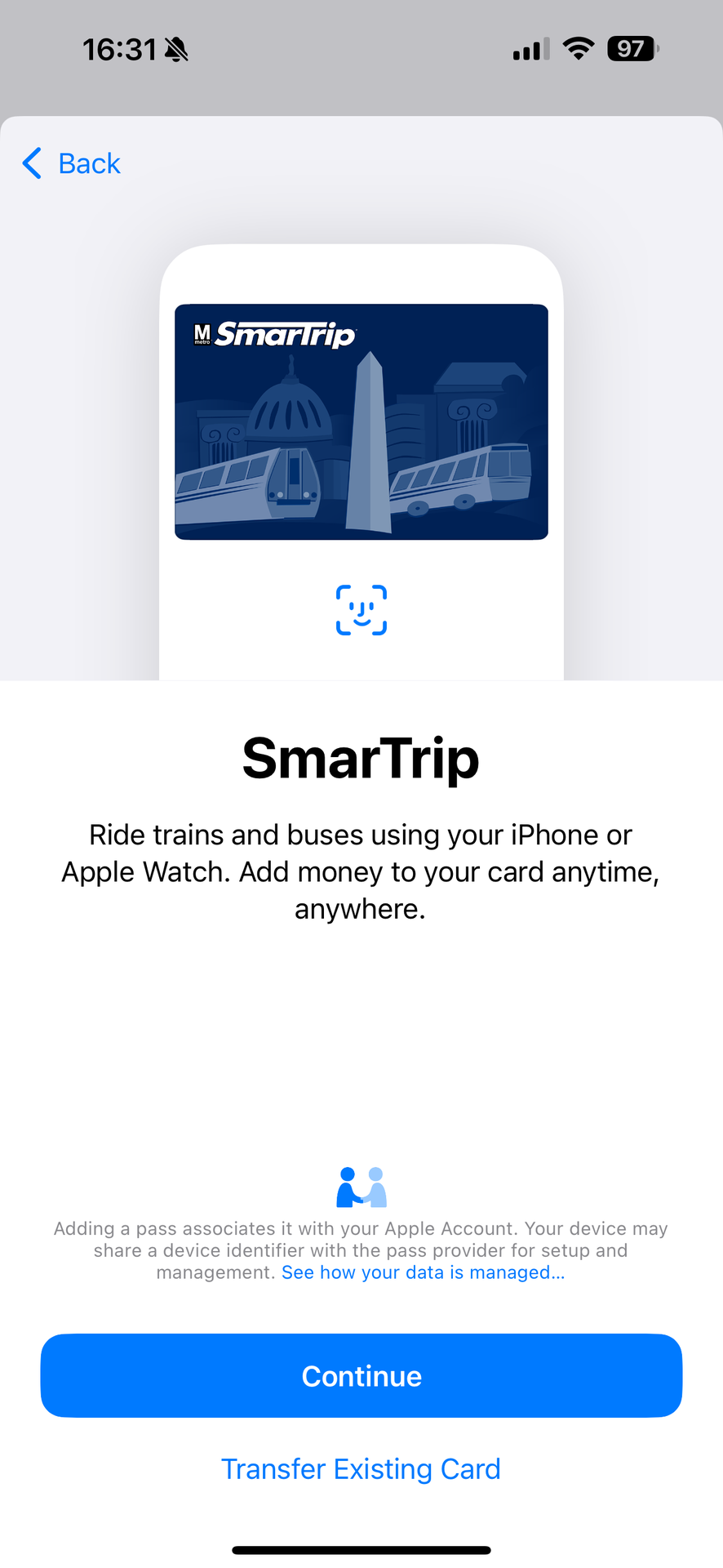 I just returned from ten days in Washington DC, where I got around solelyby walking and public transit (bus and train). It was awesomely efficient. One of the more difficult things to suss out priorto visiting was the use of the SmarTrip app. The short summary: you don’t need it if you’re a tourist. Just use the Wallet function.