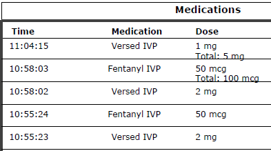 - As per last time, i received 100 mcg of fentanyl(IVP) and 5 mg of versed (also IVP). The clinic notes had a nicely formatted table listing precision down to the second: