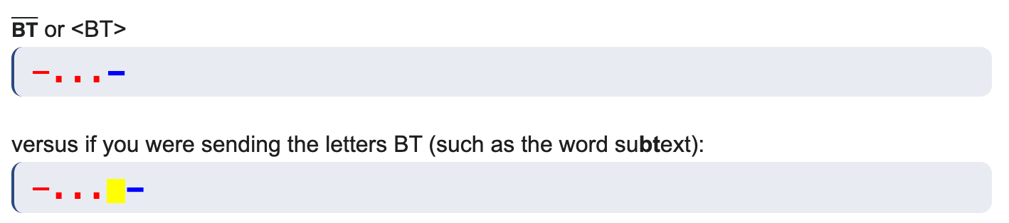 BT has two meanings depending on context (of course!): a topic separation (like a paragraph break) or the equivalent of filler words (uh, ummm) in CW. BK, mentioned in session 10, means break and is often used in lieu of doing the formal station identification for handover (e.g., WS6Y de WT8P) each time.