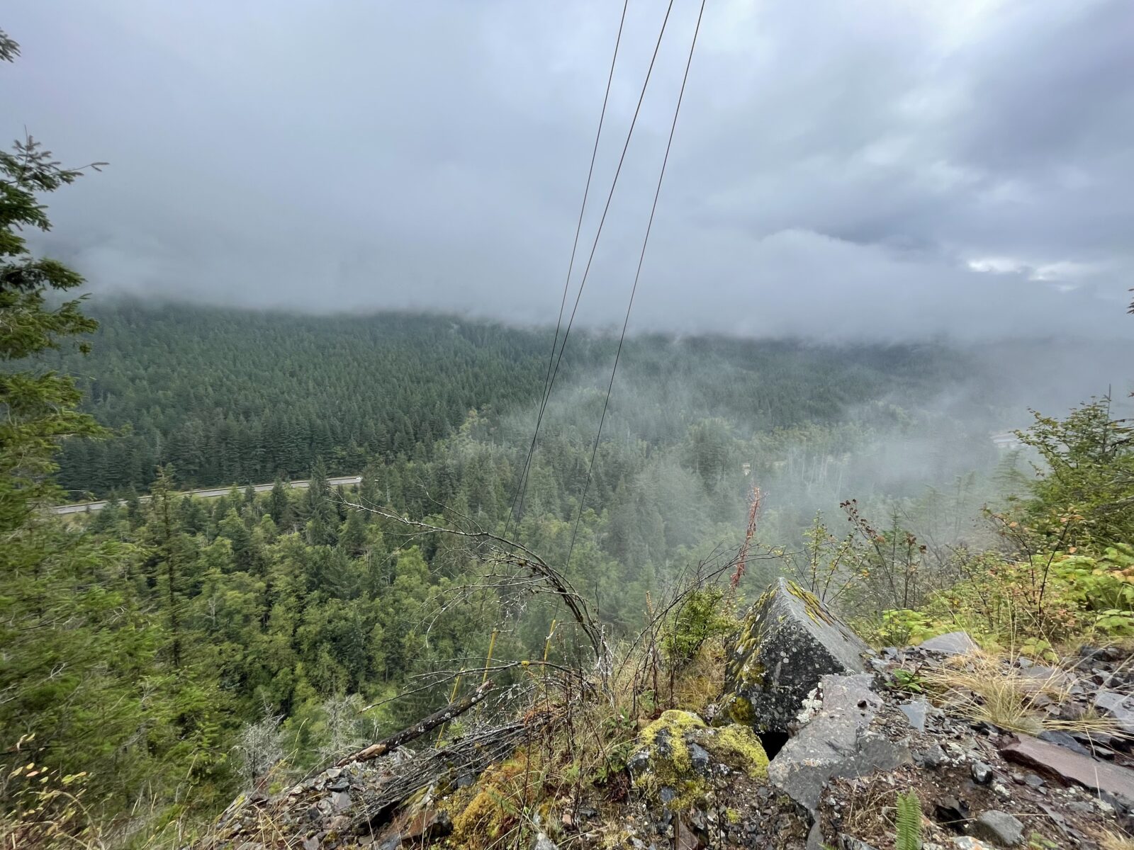 And, finally, we emerge from the tunnel. There is a pit toilet and a couple of picnic benches that make for a nice stop to remove the jacket, grab a snack, and blow snot rockets out of both nostrils. During the marathons, there are volunteers with a drop for headlamps and jackets, and a table with water/Nuun (sports drink,cosponsor). As this is mile 2.3, the pack is still relatively tight. Since there are picnic benches, I hung out until the flow of folks emerging was reduced to a trickle. Wouldn’t you know it just as I removed my jacket, rain began?