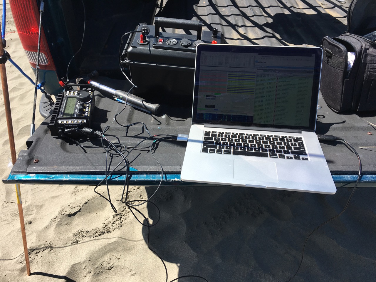 We had a late start Sunday morning, but tried a more conventional Buddipole setup. This was the first time I’d used one, but found its engineering very thoughtful. Every connector had a snap-on rubber cover, and there were velcro bands for attaching things to other things. We mounted it on the truck bed, tethered to the sides. I’d have to do more tests with it.