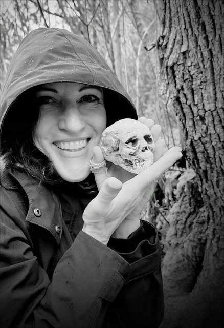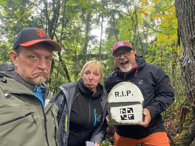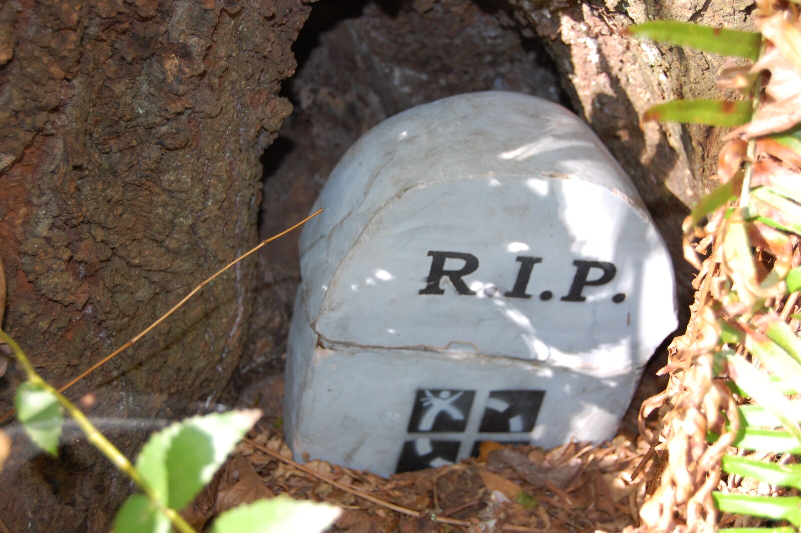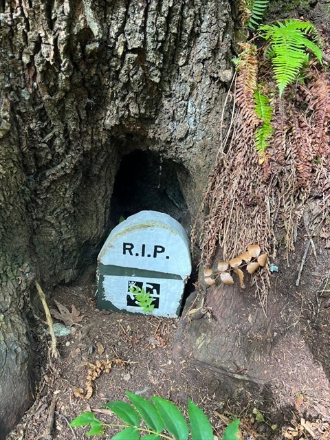 I did some light sanding to smooth out the blobby bits, then let it cure for a couple of days. I painted the entire thing with a white appliance acrylic, then added stencils for the Geocaching logo and stickers for RIP. The name, was a little hard to read. Finally, I added a miniature foam skull for “George Cachinski” and tethered it to the top. It’s “not scary” and people seem to be having fun with it.