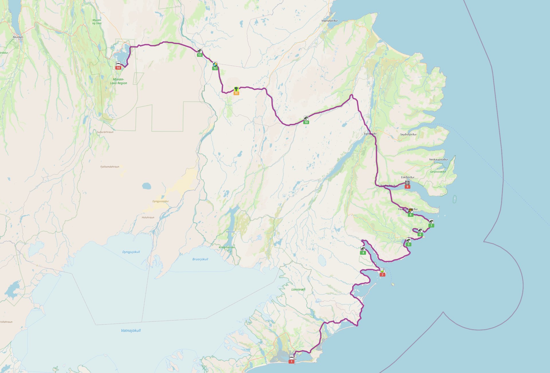 On the way out, I’ll stop at Goðafoss for the waterfall and geocaching. Next town is Akureyi, which will probably be a breakfast stop before picking up the penultimate waypoint for an Adventure Lab whose bonus final is somewhere near Reykjavik. It’s the last of long drives.