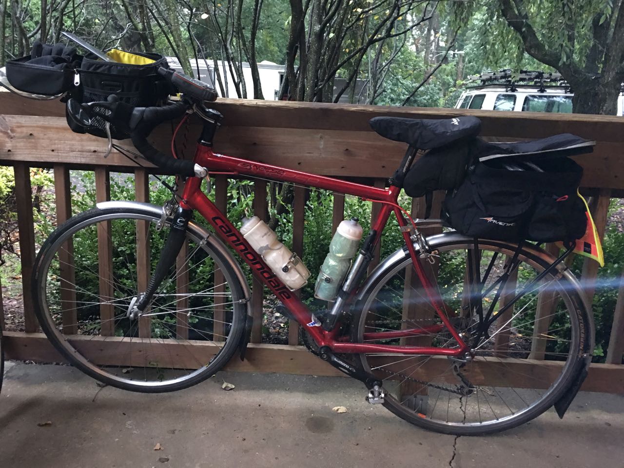 I didn’t sleep well due to the First Day Of Tour jitters. Also, the cheesesteak didn’t agree with me. (Note to self: you are no longer 19.) I was rearranging stuff for a while before going with the Showers Pass jacket. I’d need it, as it rained moderately hard for the first thirty miles.