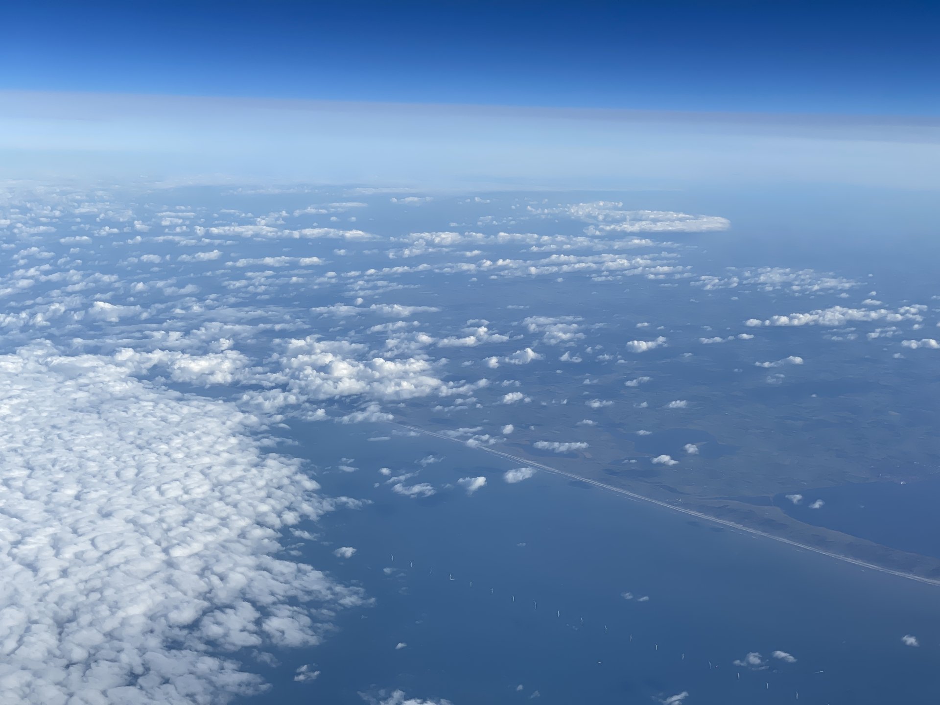 The four-hour flight was about as good as it can be: uncrowded, good food, and I had the entire row to myself. (Announcements were in Icelandic, Czech, and English.) Once it was daylight, I could enjoy the scenery. The photo above was taken just west of Denmark. At 38,000′, you can still see the line of wind turbines paralleling the coast.