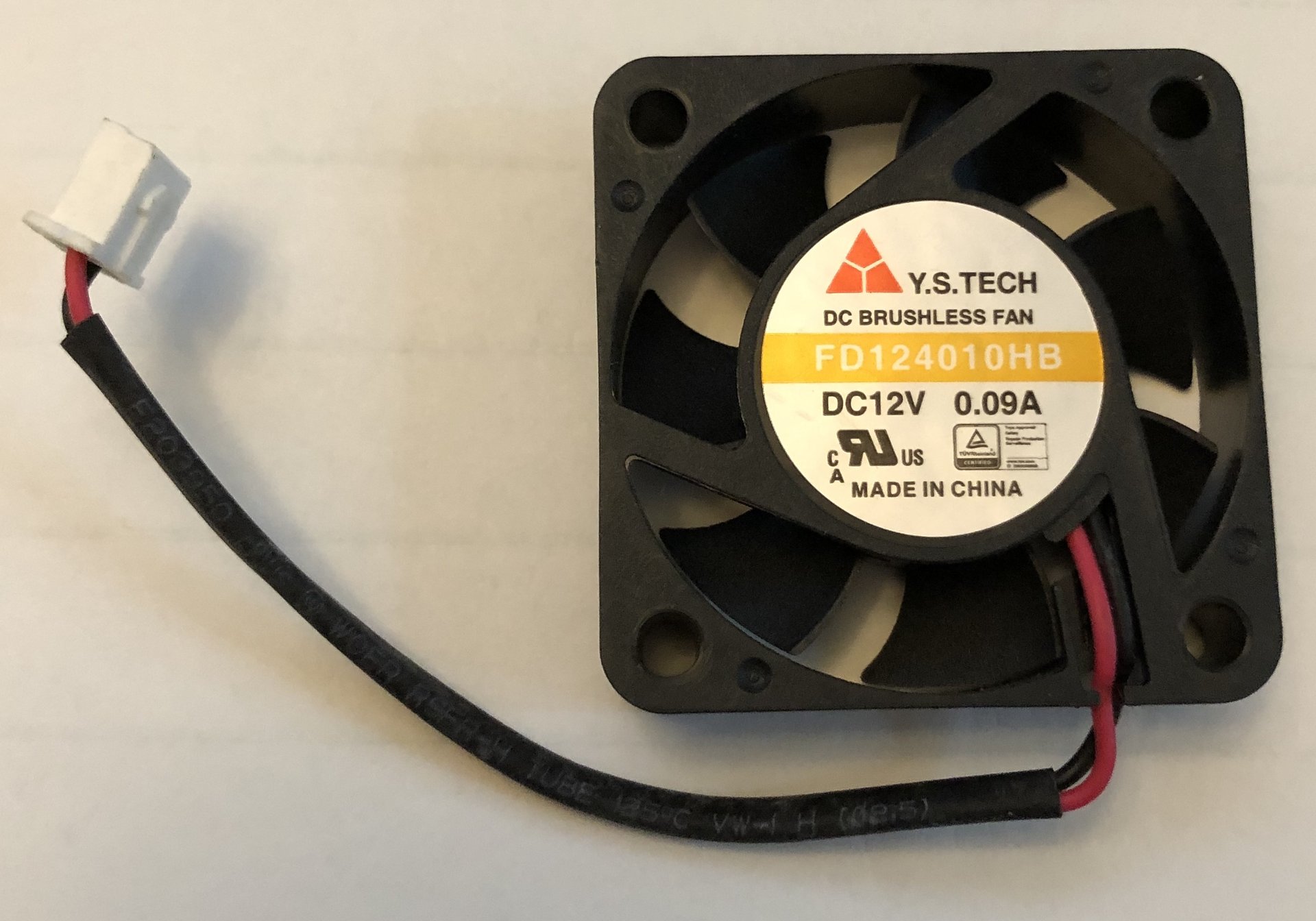 The stock fan is a Yen Sun Technology Corporation FD124010HB, a 12 volt, 40 mm square, 10 mm thick plastic fan with seven blades. Rated noise level for the newer model is 29dBa, which would be the equivalent of a library. I don’t have equipment to test, because this is bugging me enough to write about it, I’m pretty sure it’s noisier, probably closer to the sound of a dishwasher in the next room. (The radio was manufactured ~2007.)