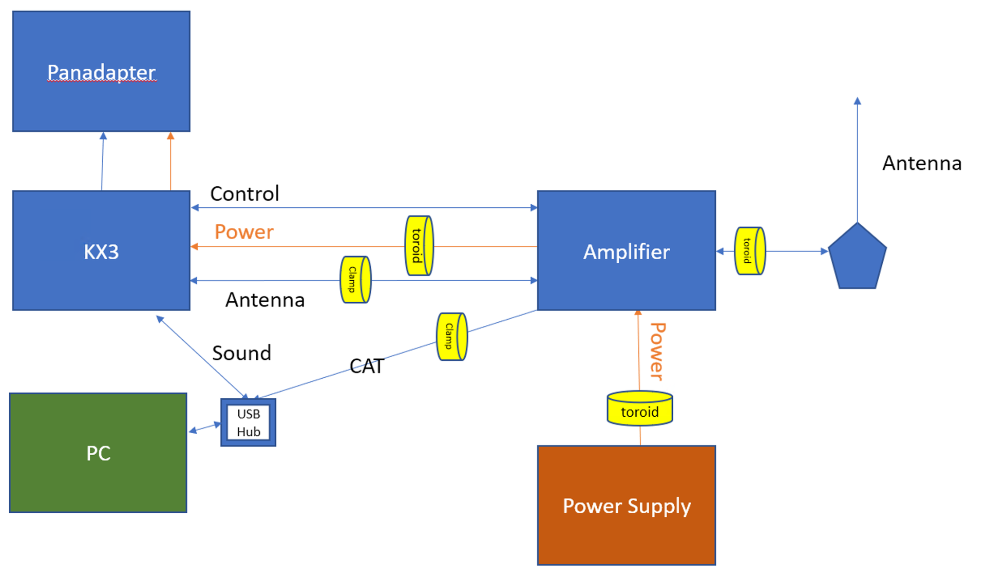 - USB cable to the KXPA100 wound several times through a #31 clamp-on ferrite.