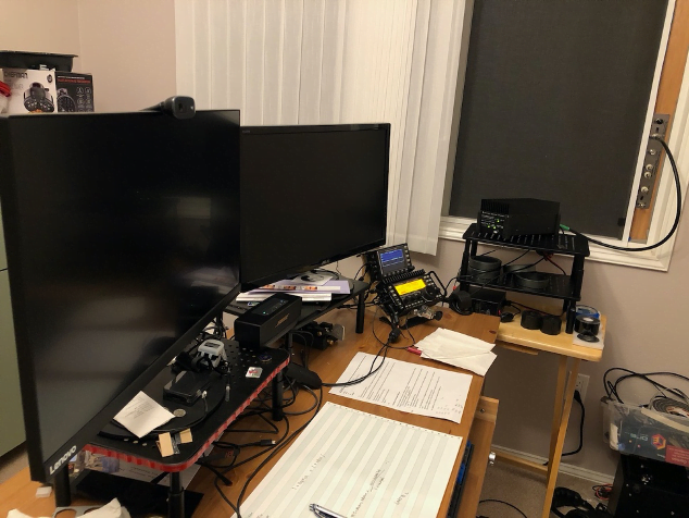 Elecraft KX3 (all-mode HF radio), Panadapter, amplifier(so I can operate above 15W!), and a PowerWerx SS-30DV switching power supply. Underneath the desk is my Dell T3420 PC running Windows 10. For digital modes, sound to and from the radio goes through a (redacted) USB hub/sound dongle. I’m usually logging contacts in real-time.