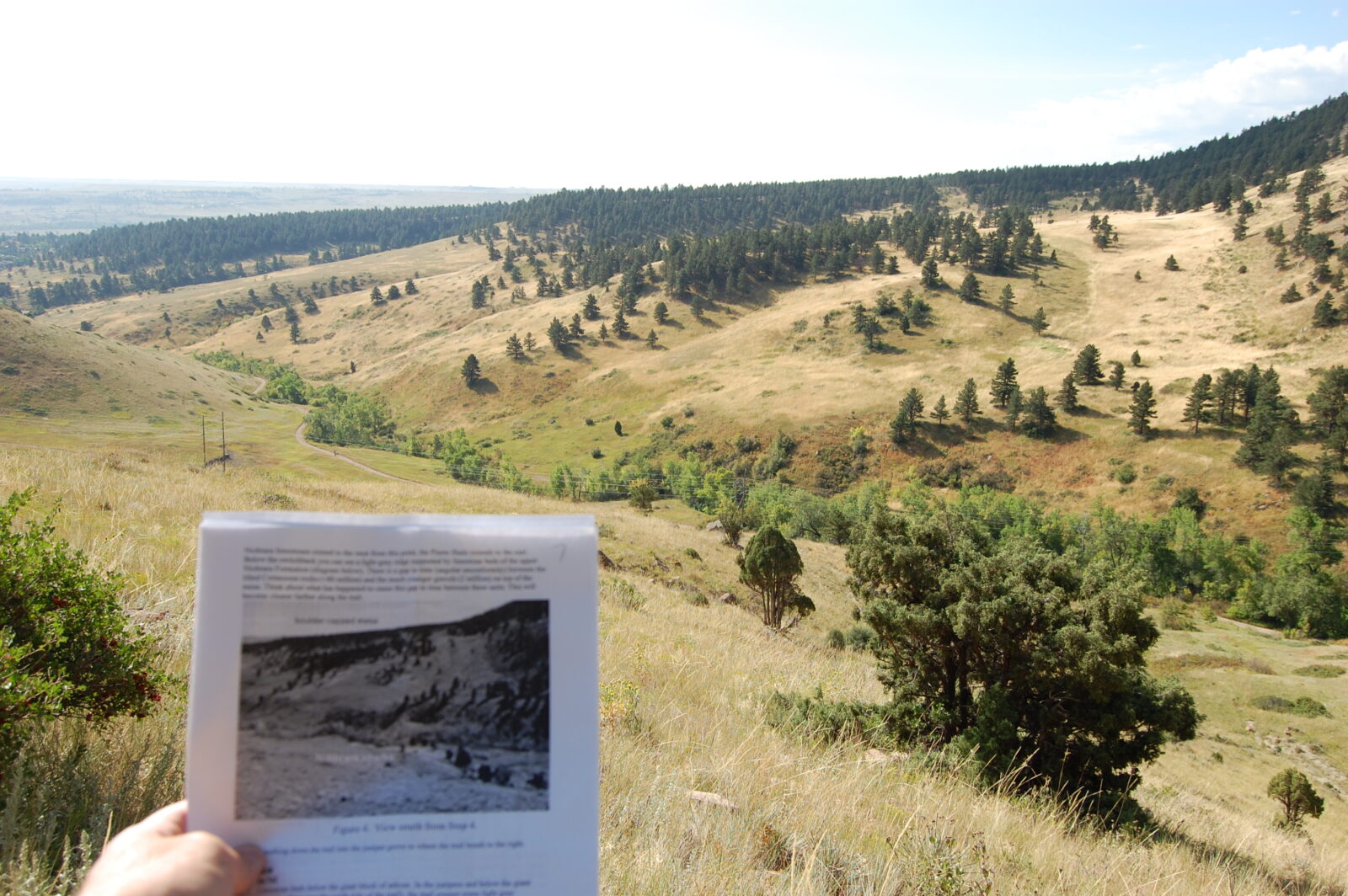 In this “knob,” there are two formations, Fox Hills (light, older) and Laramie (brown). The Fox Hills block is a horst.
