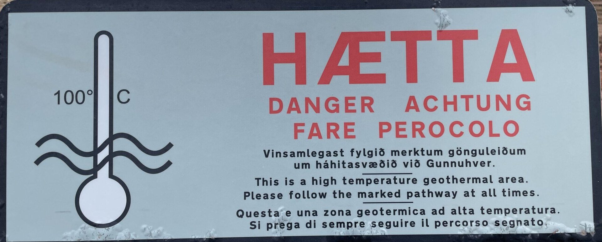 2023-10-17 Update: Carlo (IU1KGS) noticed something I had missed: this sign has a warning in Italian. (Most are Icelandic, English and German.) He conjectures there may be one or more stories behind this.