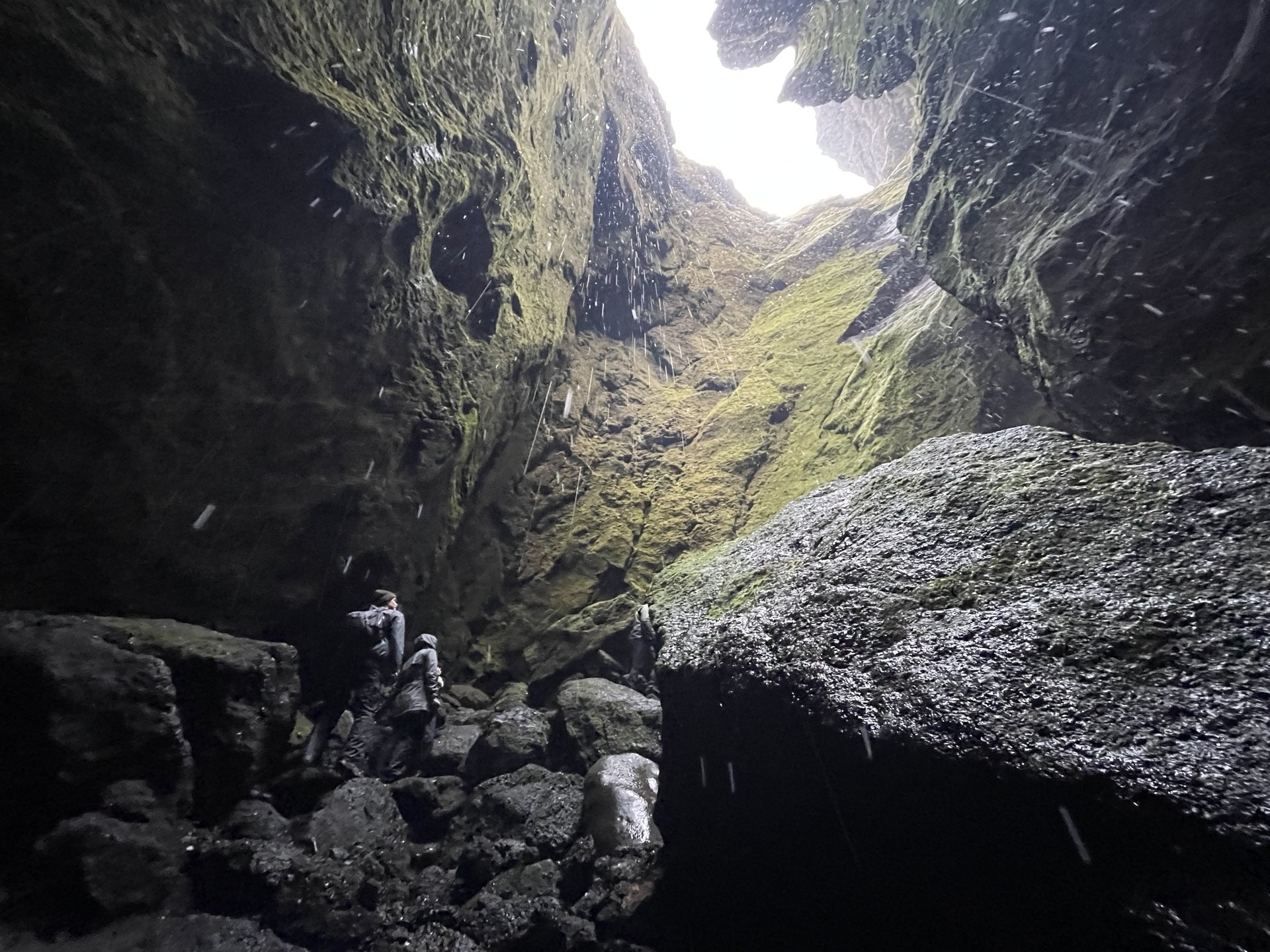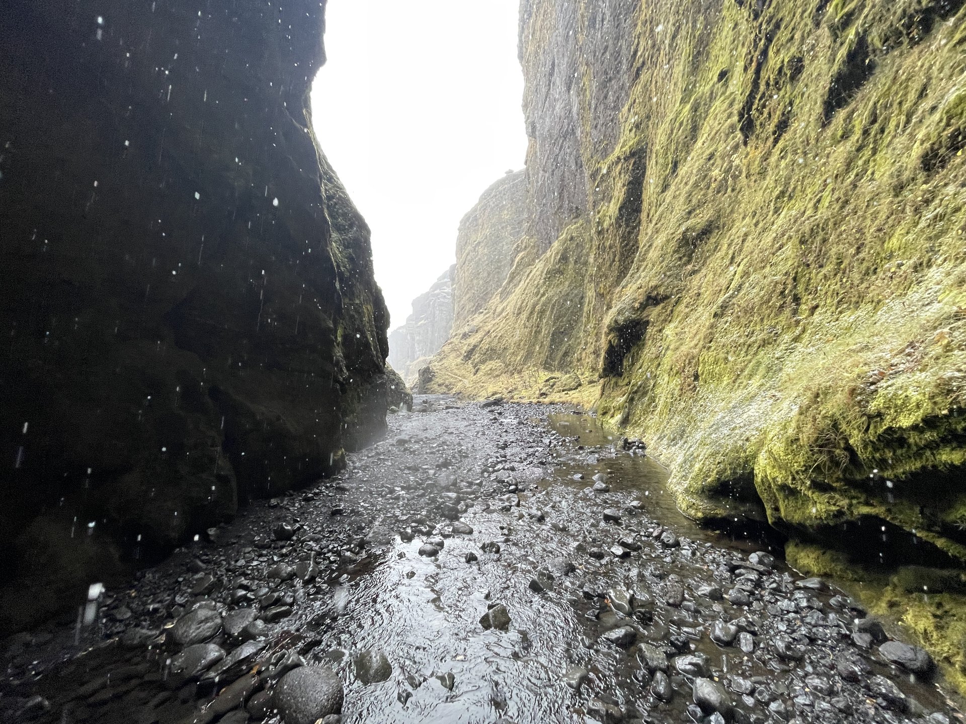 After doing this short jaunt, we had lunch, then piled into the vehicle to go to the next waterfall, name not given. We parked at N 63 40.244 W 19 33.195 and walked through a canyon that eventually turned into a gap between rocks where, inside, there was a waterfall.