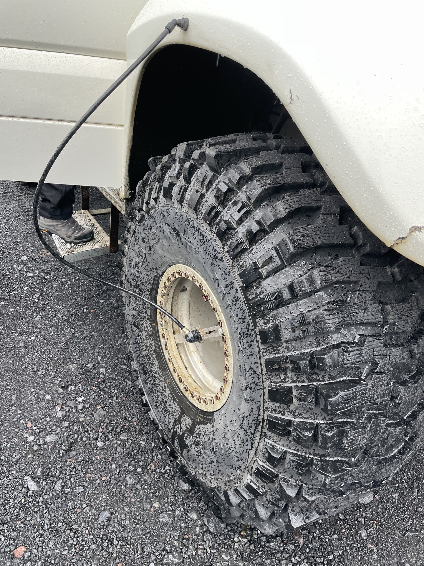 The vehicle they used to transport us is a Mercedes Sprinter 519 Bluetec 4×4 (6-speed manual) that can hold 13 people, including the driver, plus some payload. At various points on the trail, he adjust the tire pressure to be more suitable for the terrain. For example, low pressure would be good for traction or going over a rutted gravel road, while high pressure would be more appropriate for highway. On each wheel, there is a hose connecting the fender to the center of the wheel.