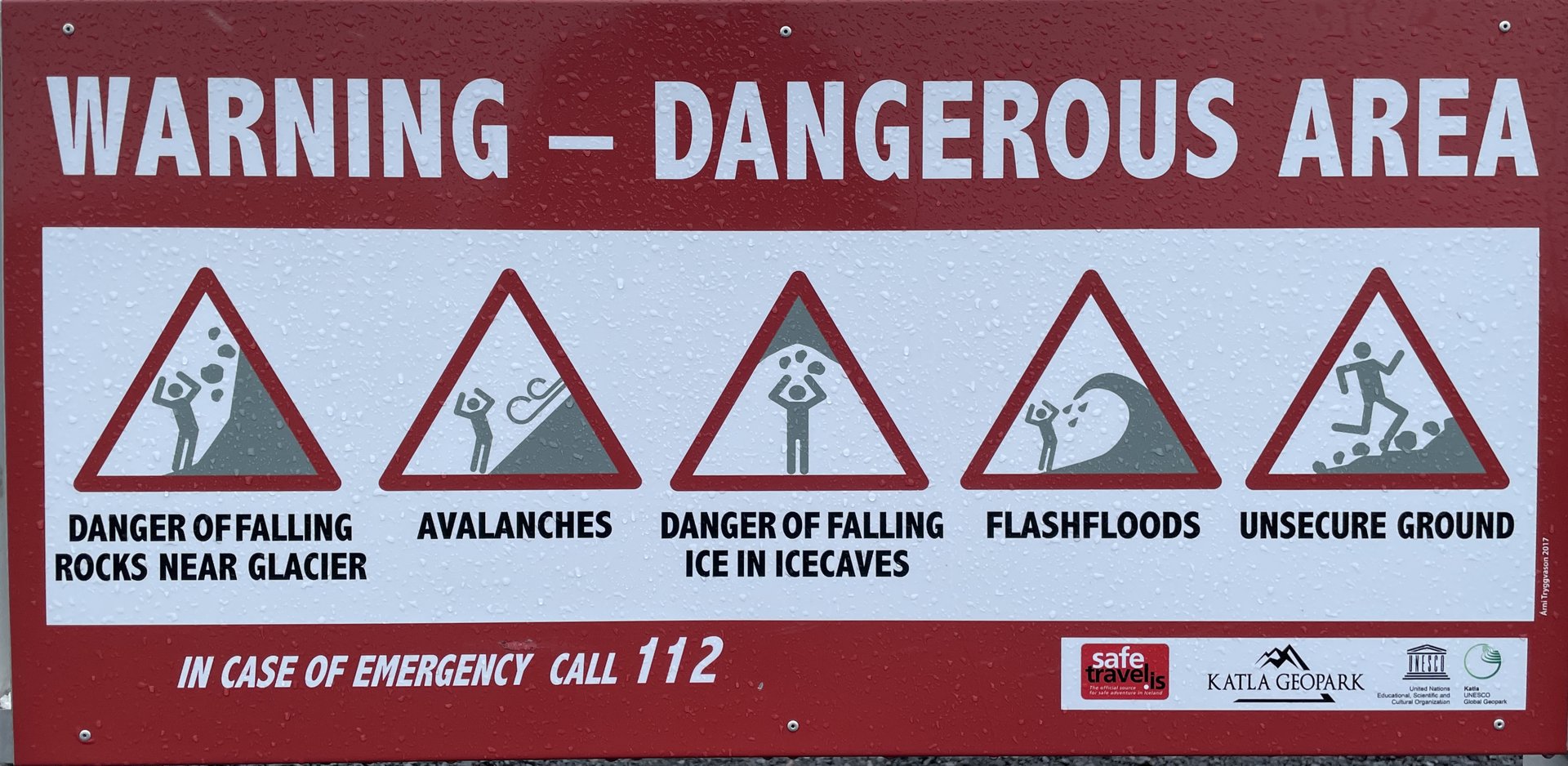 The area has undergone a lot of change. 100 year ago, the glacier covered this entire area. 20 years ago, the melting caused a large lake to form. Then in 2010, when the eruption occurred, the lake was filled with tephra and ash. In other words, there’s no longer a lake there. Thus, the sign is apropos.