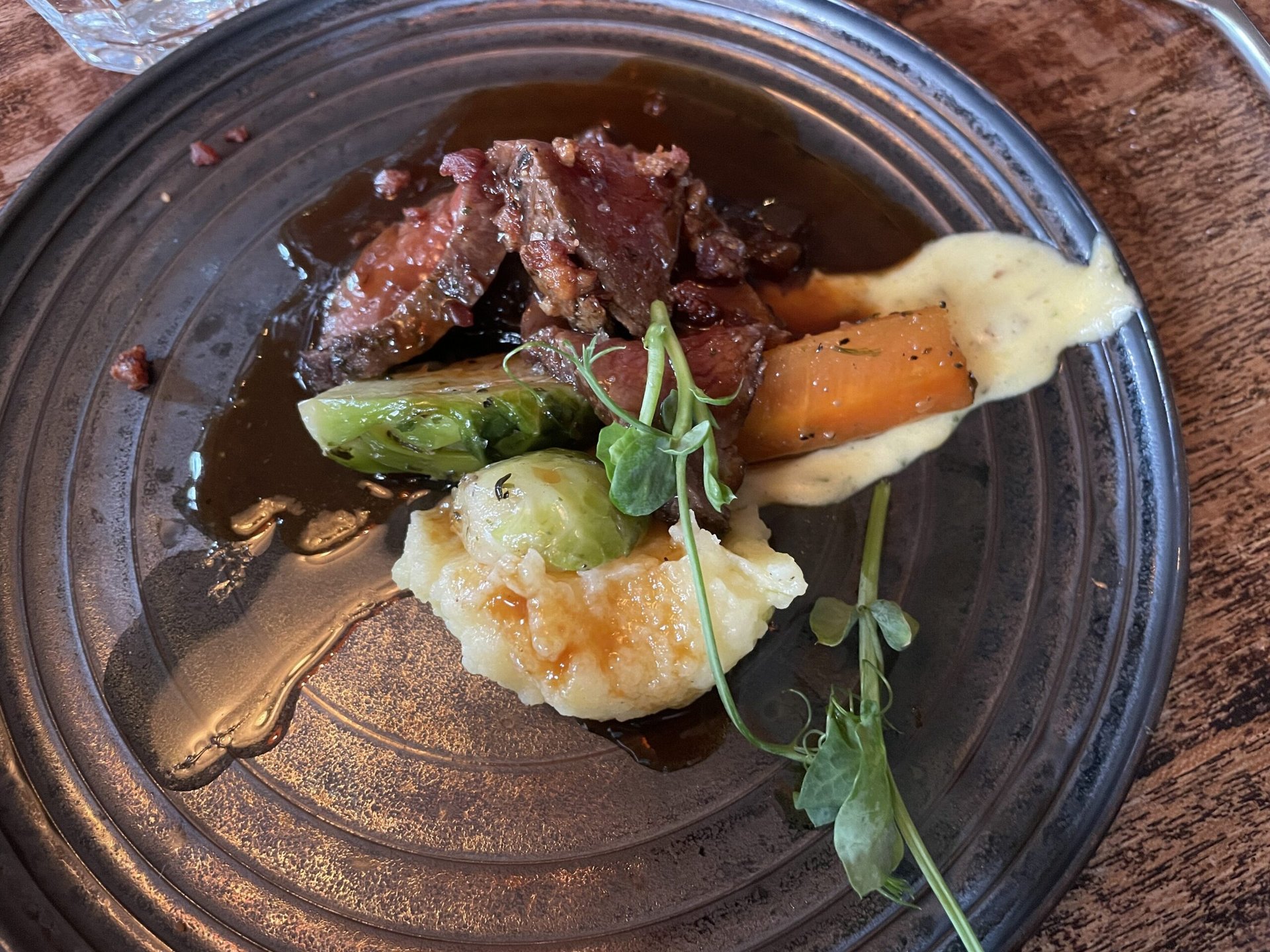 - Forréttabarinn – BLUF: I would eat here again. we had two appetizer-sized options (two choices within each) and two drinks. Weirdly, everyone in the group went for the same food choices: a soup with salmon, and a sampler of Icelandic horse meat. Both were outstanding. The meat was very tender and served with a caramelized onion/mushroom sauce, Brussels sprout, dab of potatoes. For drinks, we were given the option of beer, red wine or white wine. While the 0.5L of beer I had was fine, the quantity is something I’d nurse over the entire evening. I could only make it through half.