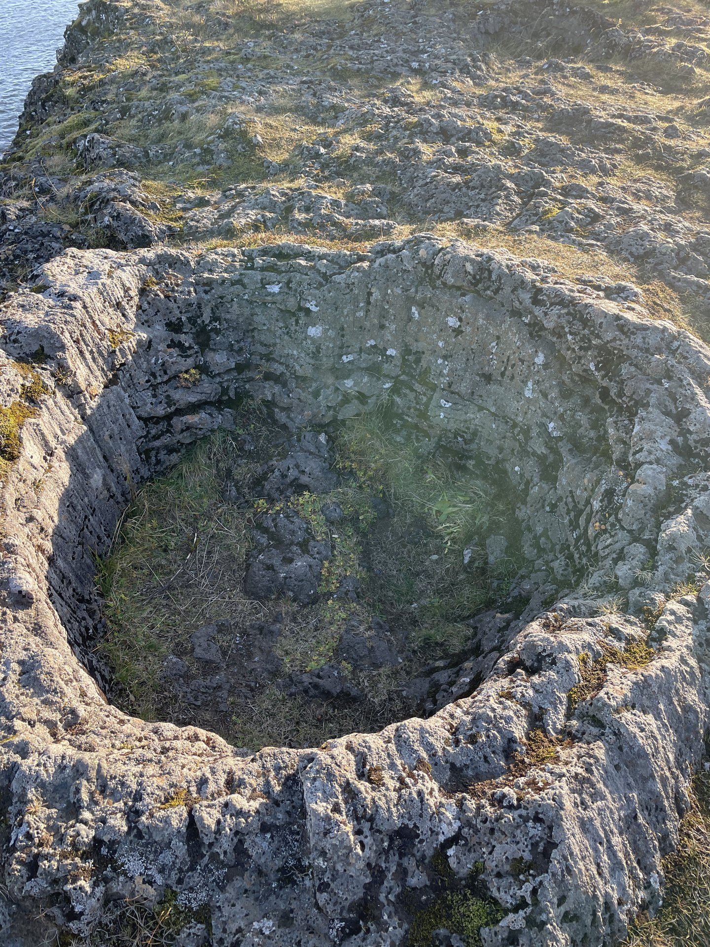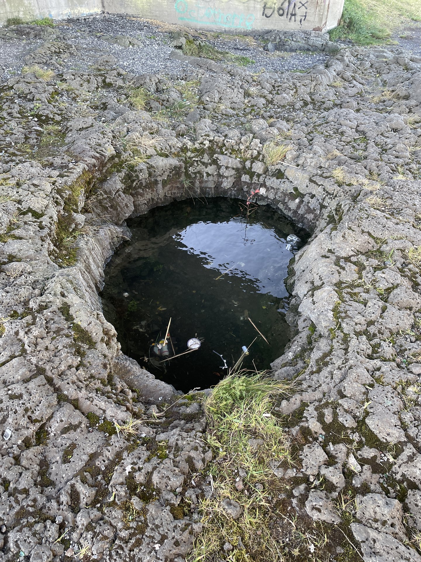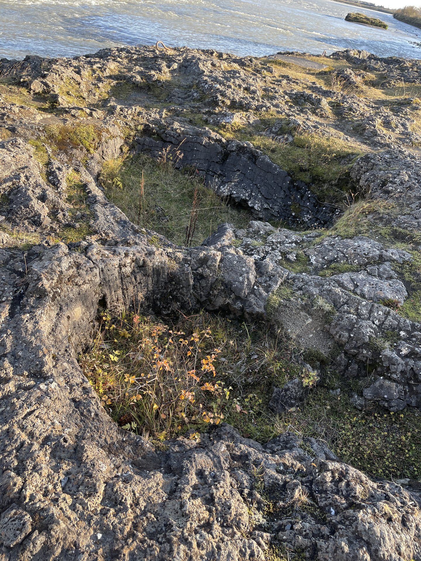 The second major stop was near the river Ölfusá in Selfoss. There was convenient parking in a grocery store to walk a short stop to the riverside where there were several circular “pots” approximately 1-2m across. These are believed to be “traces of large bubbles of gas” that came up in molten lava from the Þjórsárhraun flow 8,700 years ago. (Þjórsárhraun is also said to be the largest flow since the ice age.) Here are three of the set.