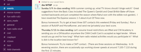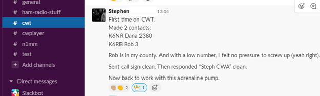 - We added channels for the tools (N1MM, CWPlayer and Morse Runner) once there were enough discussions to merit another. At one point, I also posted links to YouTube tutorials I made on using N1MM for CWT and using Morse Runner and slack was smart enough to embed them.