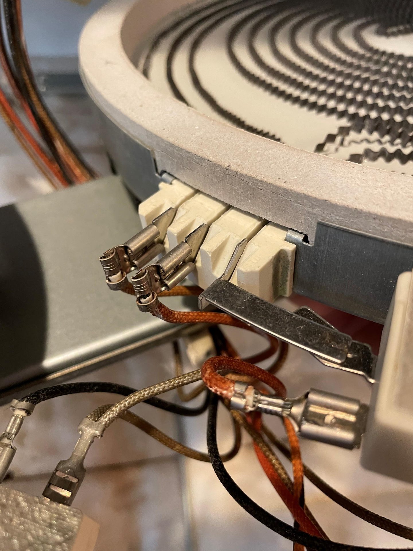 If all was successful, you can flip the burner over. Take a few more photos of the wiring just in case. In the photo below is the old burner. The ceramic is cracked around the edges. The heating components are the squiggly wires forming two circuits. The long tube is the thermostat unit. Theoretically, you should be able to attach a voltmeter to it and look for an short circuit. This didn’t work for me, which is why I did the thermodynamic test above.