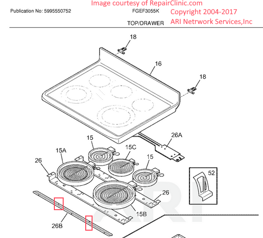 Now, loosen the screws on each end of the crossbar (this is part 26 on the diagram above) holding the elements flush against the surface. In the photo below, I’ve drawn on part numbers for 26B, 26 (crossbar). The two screws are just on the end of each side. Gently lower the burner assembly down onto the insulation, and rotate it slightly so you can release the three clips (green rectangles) to remove the element.